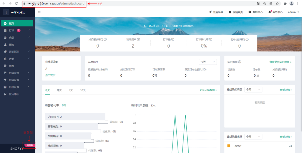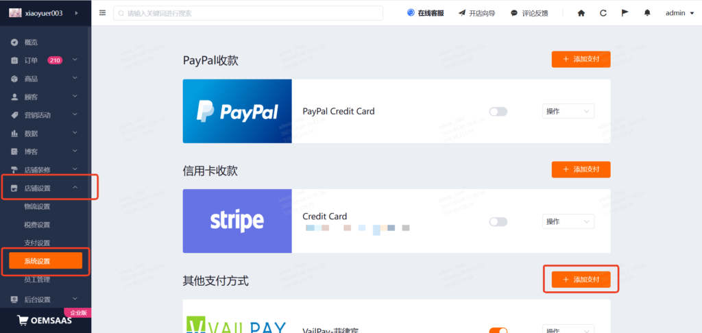 3、A站第一步:店铺后台,添加支付方式A站第一步,进入A站后台管理系统点击→店铺设置→支付设置→其他支付方式→添加支付