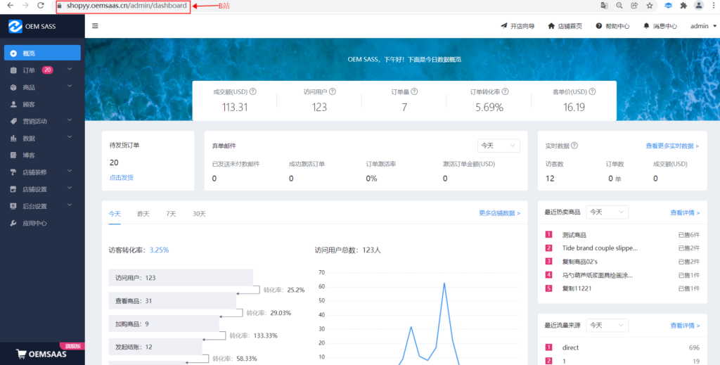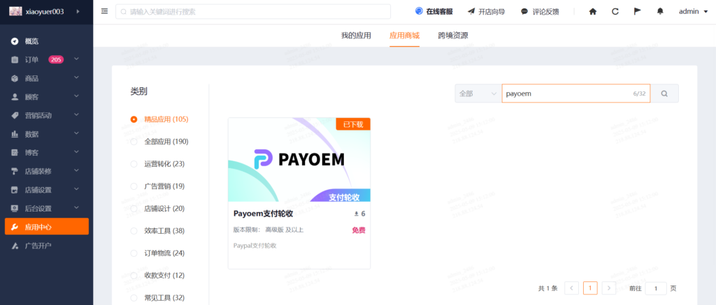 2、B站是用来上常规商品的,需要添加Payoem轮收系统插件,我们的配置都需要在B站应用中心完成配置;下图为B站