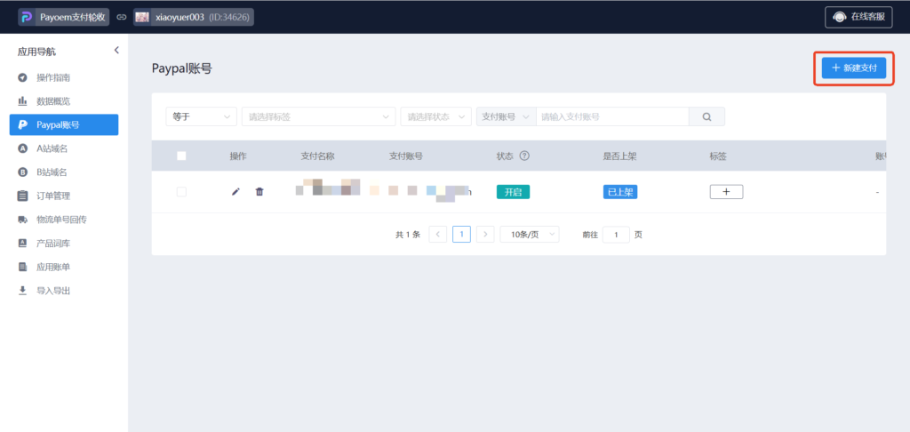 10、第一步,如果使用的收款账号是Paypal账号,点击新建支付