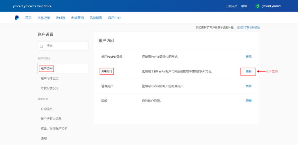 14、账户设置→API访问,点击更新,进入查看API凭证页面