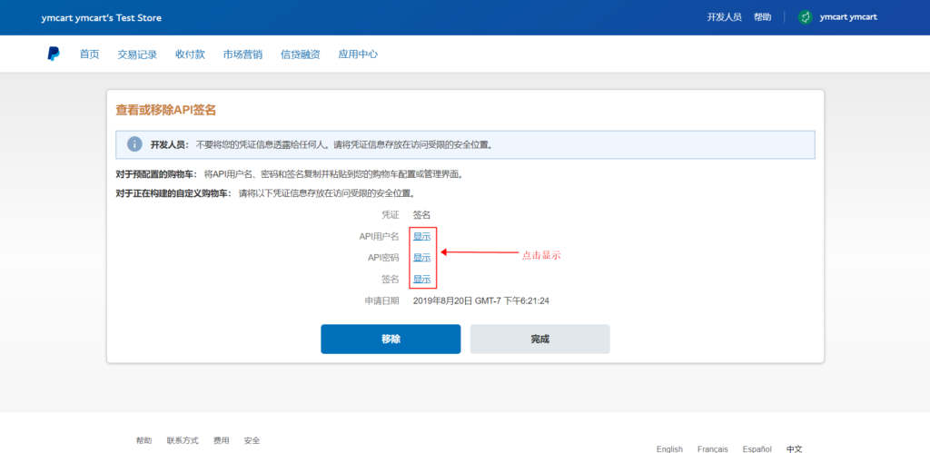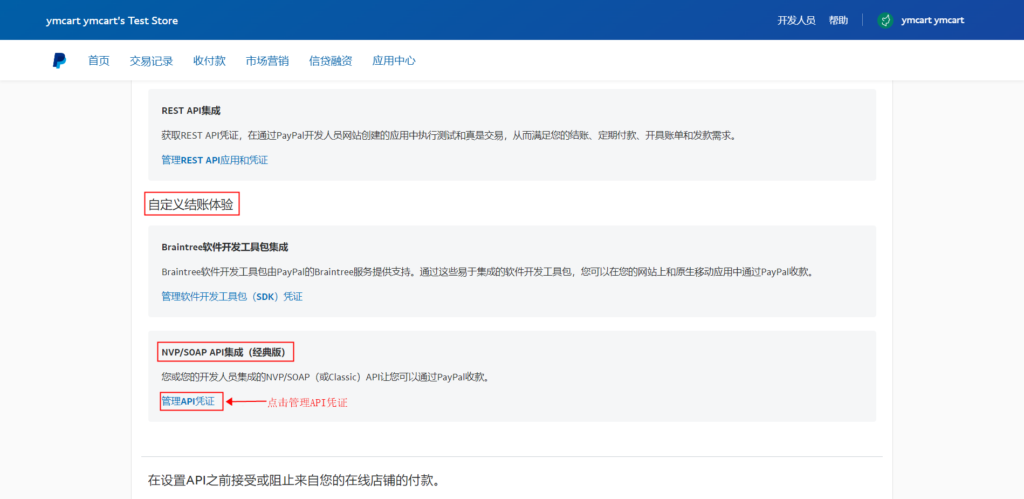 15、找到自定义结账体验→NVP/SOAP API集成(经典版),点击管理API凭证,进入查看或者移除API签名页面