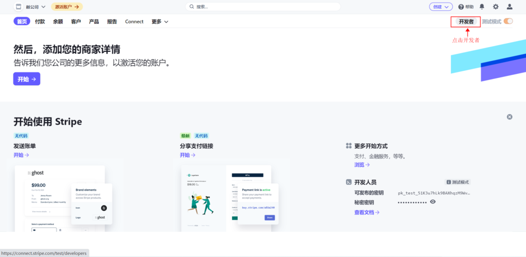 27、接下来进入Stripe官网https://connect.stripe.com/login,输入账号密码登录,进入Stripe首页,点击开发者