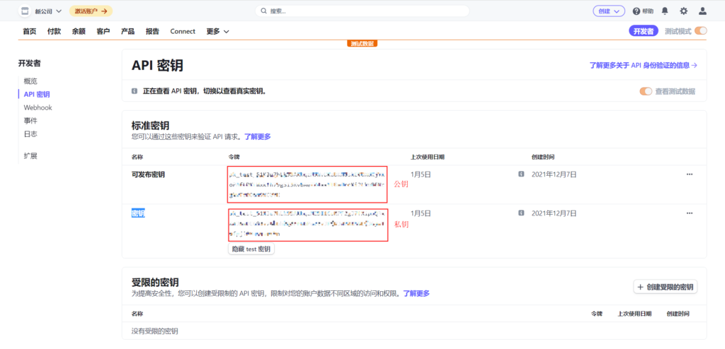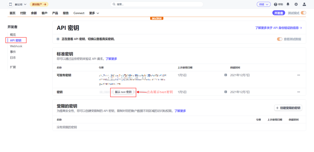 28、找到API密钥,点击展示test密钥