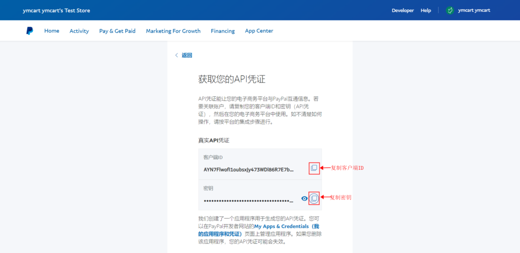 24、复制客户端ID、密钥(也可以直接访问链接获取ID和密钥。https://www.paypal.com/signin?returnUri=https%3A%2F%2Fwww.paypal.com%2Fcommercesetup&state=%2FAPICredentials)