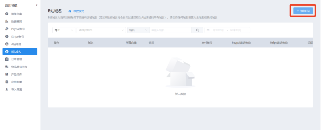 42、B站第五步,添加收款账号,点击关联账号(B站域名为B站店铺域名,如需添加,请至店铺后台添加域名即可)