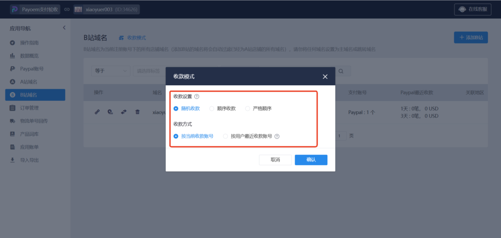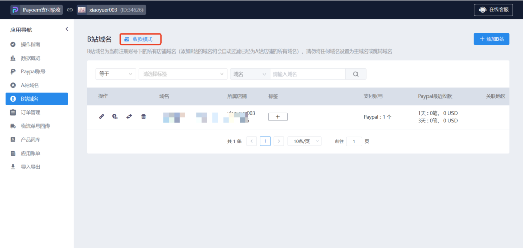40、收款模式设置,选择菜单“B站域名”进入,点击收款模式
