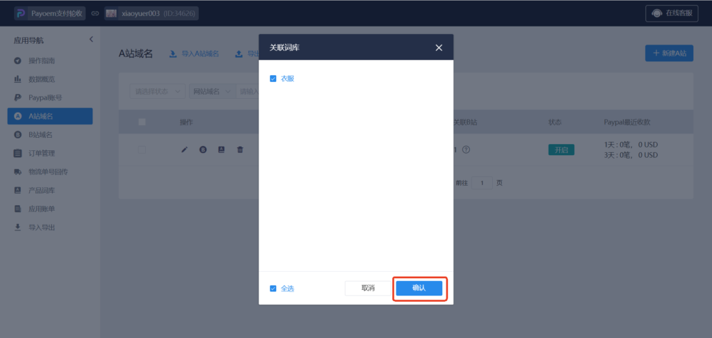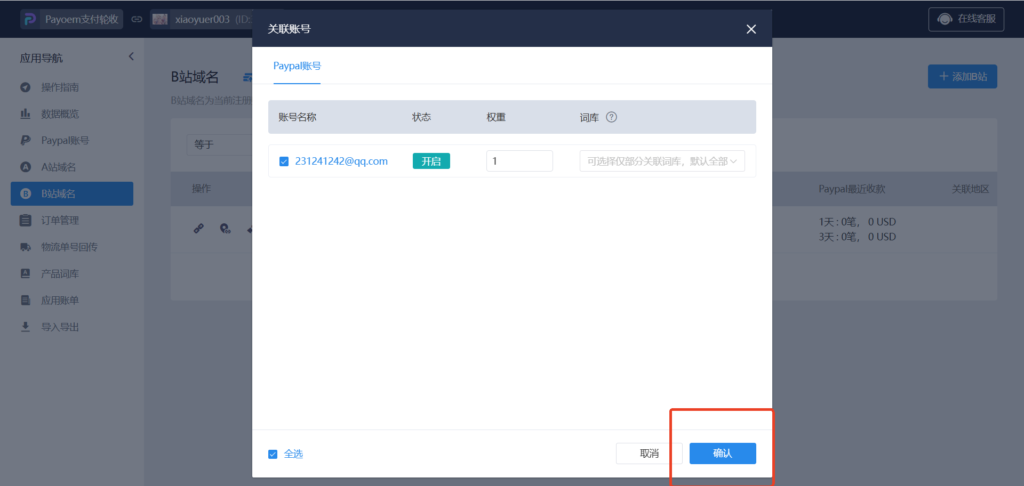 43、Paypal账号:输入权重,勾选PayPal关联账号