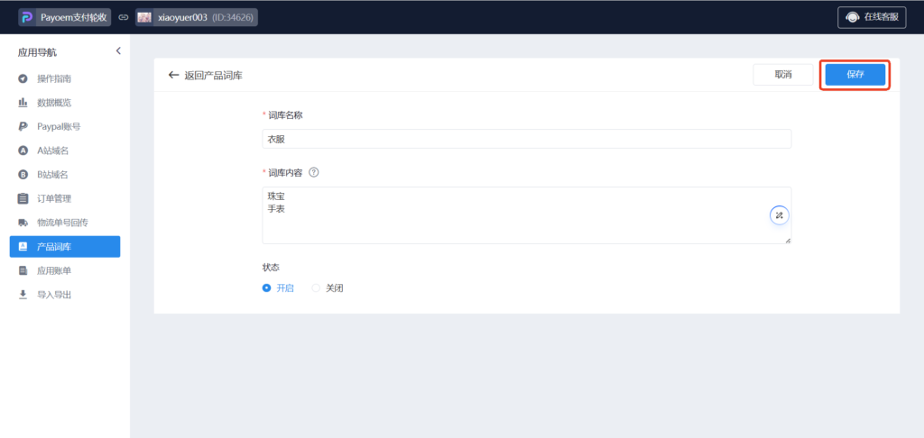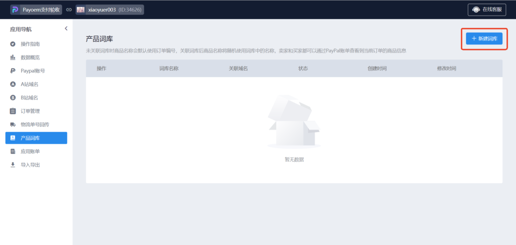 44、B站第六步,进入产品词库页面,点击新建词库(词库用于A站订单支付的时候显示商品名称的替代简称,如果不配置,默认显示订单编号)