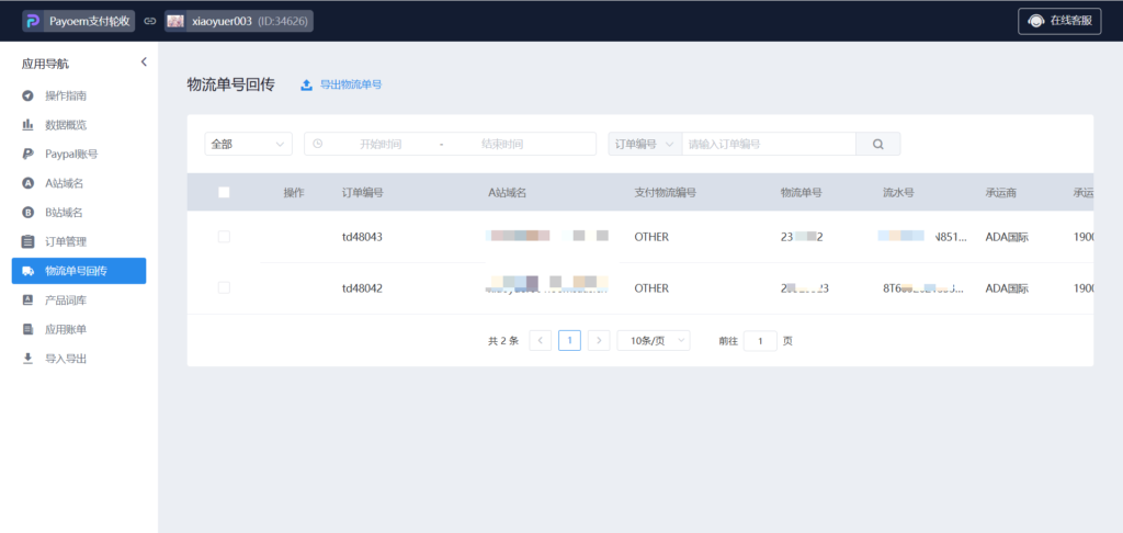 51、接下来回到B站Payoem收款轮收系统插件物流单号回传,可以看到A站发货的订单信息