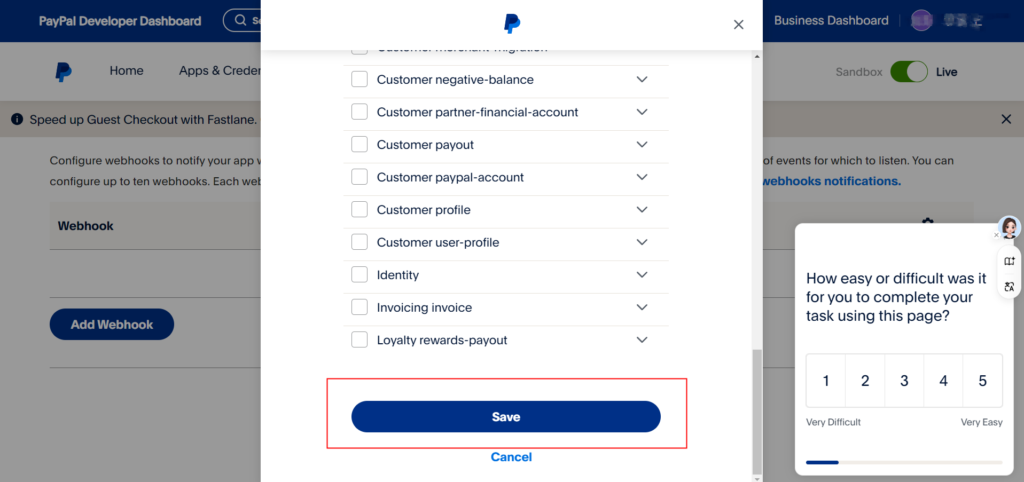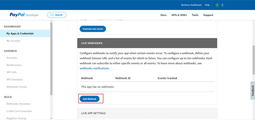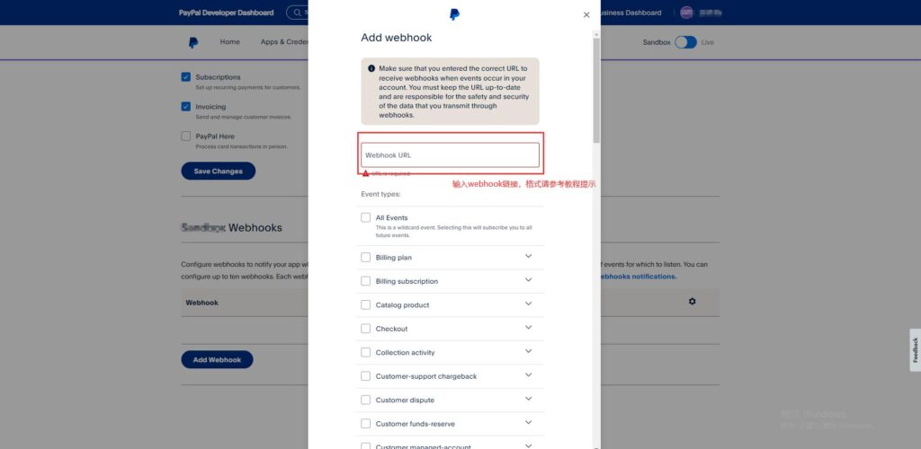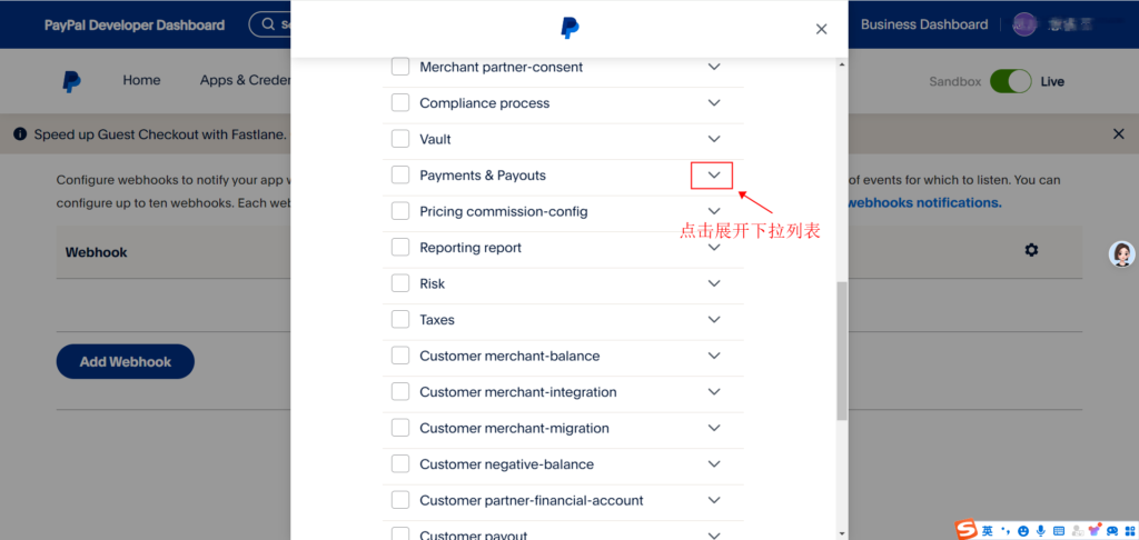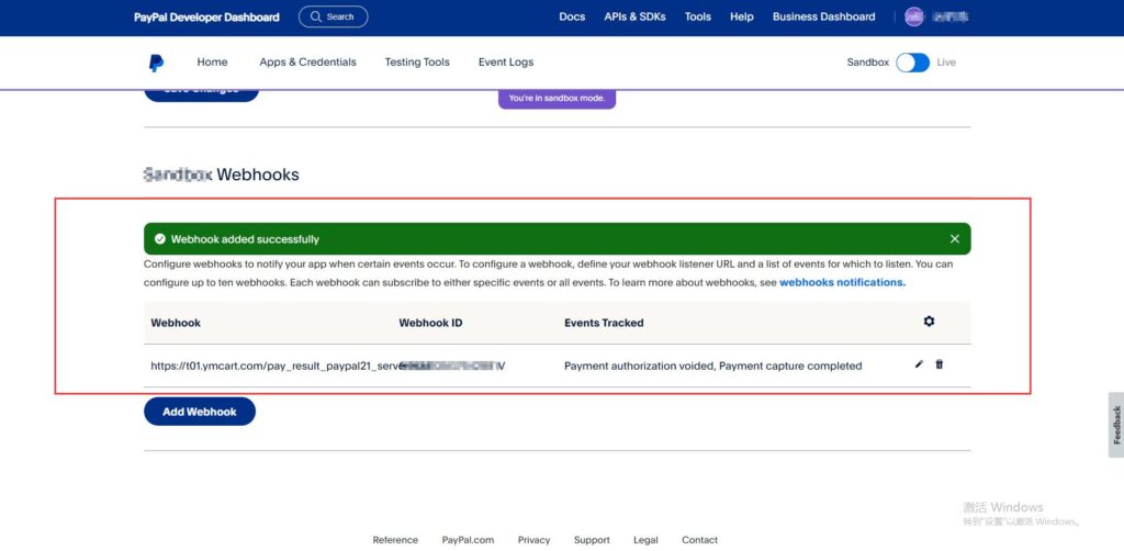 2、回到paypal将页面滚动至下方选择【Add Webhook】